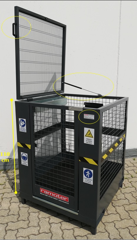 Sul lato di ingresso sono stati ingranditi in modo che siano ben visibili i pericoli legati a questa attrezzatura e gli obblighi dell'operatore. Inoltre abbiamo inserito una striscia giallo-nera su tutti i lati del cestello per una maggiore visibilità, come richiesto da normativa.